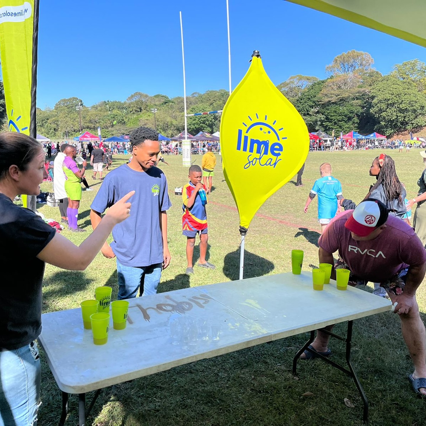 - WOB Junior Rugby Event and Comrades Watch Party Activation: This activation featured a lively promotional stand with interactive activities such as a beer pong game, lime-themed challenges for families, and branded giveaways. Visitors who engaged with LimeSolar information received free drink tickets, bringing high energy and community engagement to the event.